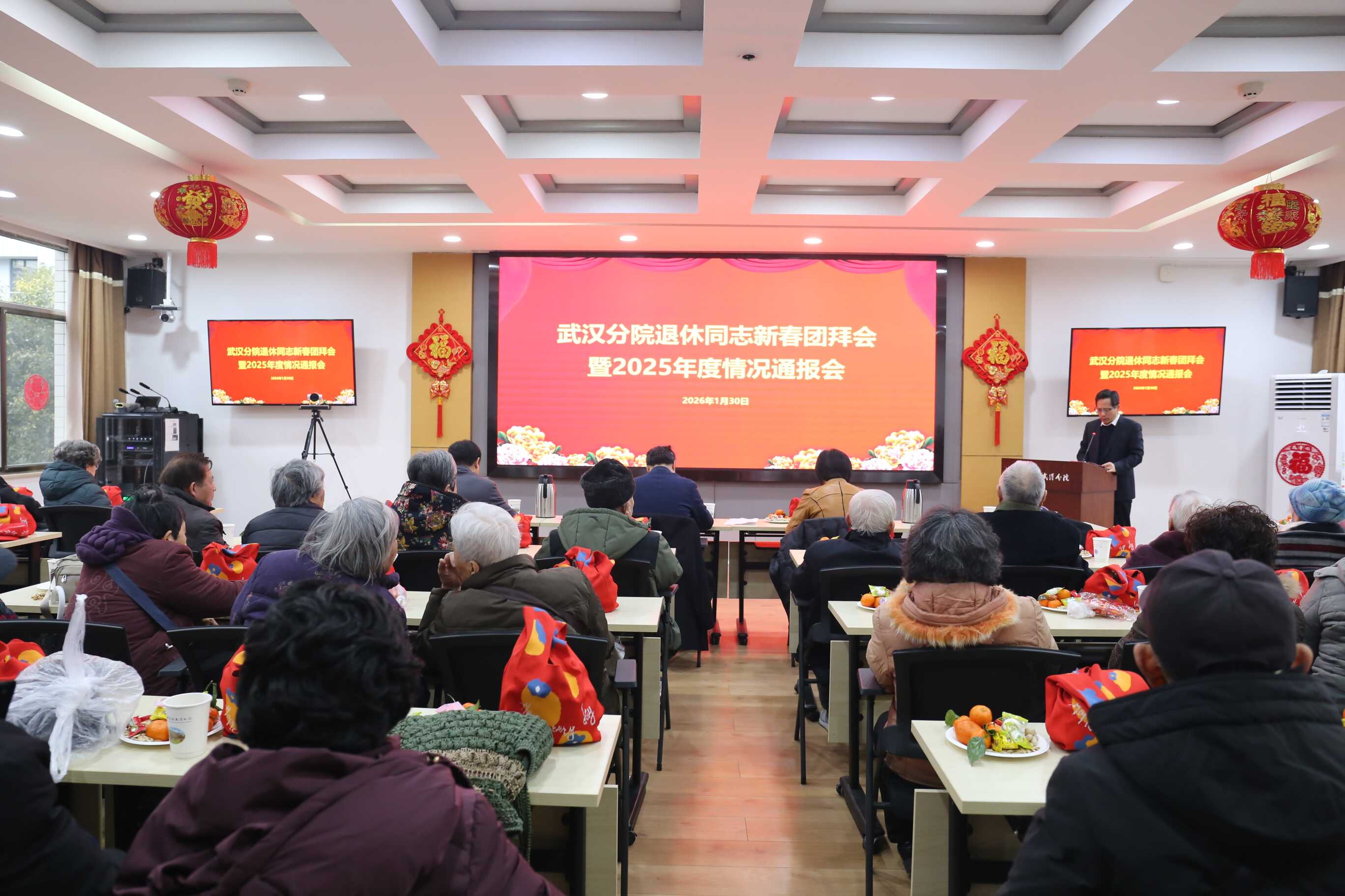 马踏祥云驮福至,花开盛世报春来。1月30日,武汉分院召开退休同志新春团拜会暨2025年度情况通报会。武汉分院分党组书记、院长李海波,分党组副书记曾静,副院长关武祥和纪检组组长徐红革与退休老同志90余人欢聚一堂,庆贺即将到来的新年。会议由徐红革主持。