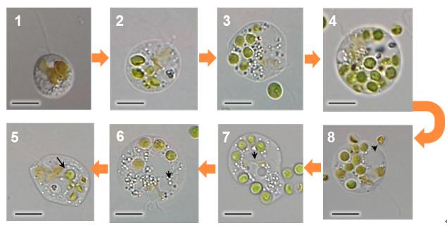 小球藻是一种有重要商业价值的微藻,然而在其规模化培养过程中常发生溃败。通过长期跟踪研究,中国科学院水生生物研究所胡强研究员团队首次发现一种混合营养型鞭毛虫Poterioochromonas malhamensis(马勒姆杯囊棕鞭藻)是小球藻规模化培养中的关键危害物,并从爆发频率、流行季节、危害范围和摄食特征等不同角度解析了该鞭毛虫在小球藻培养中的危害特点,同时探究了不同环境因素(温度、光照强度、pH值、CO2浓度等)对该鞭毛虫生长的影响。结果发现在培养基中通入高浓度CO2维持培养基低pH值,可以有效降低鞭毛虫细胞内pH值,从而实现对鞭毛虫的控制。为了进一步探究鞭毛虫与小球藻的相互作用机理,科研人员以鞭毛虫P.malhamensis和多株微藻为研究对象,分析小球藻的种类、生化组成、细胞大小、细胞壁厚度、生长速度以及与鞭毛虫的细胞数比例等对鞭毛虫摄食和生长的影响因素,结果表明鞭毛虫可以摄食自身体积以下的所有微藻。对于小球藻而言,微藻的细胞壁厚度和生长速率是影响鞭毛虫摄食的主要生物因素。此外,在此基础上,科研人员还分离到一株可以抵抗鞭毛虫捕食的抗性藻株,初步分析该抗性机制与小球藻细胞壁上某些由半乳糖胺组成的细胞壁结构的缺失有关。