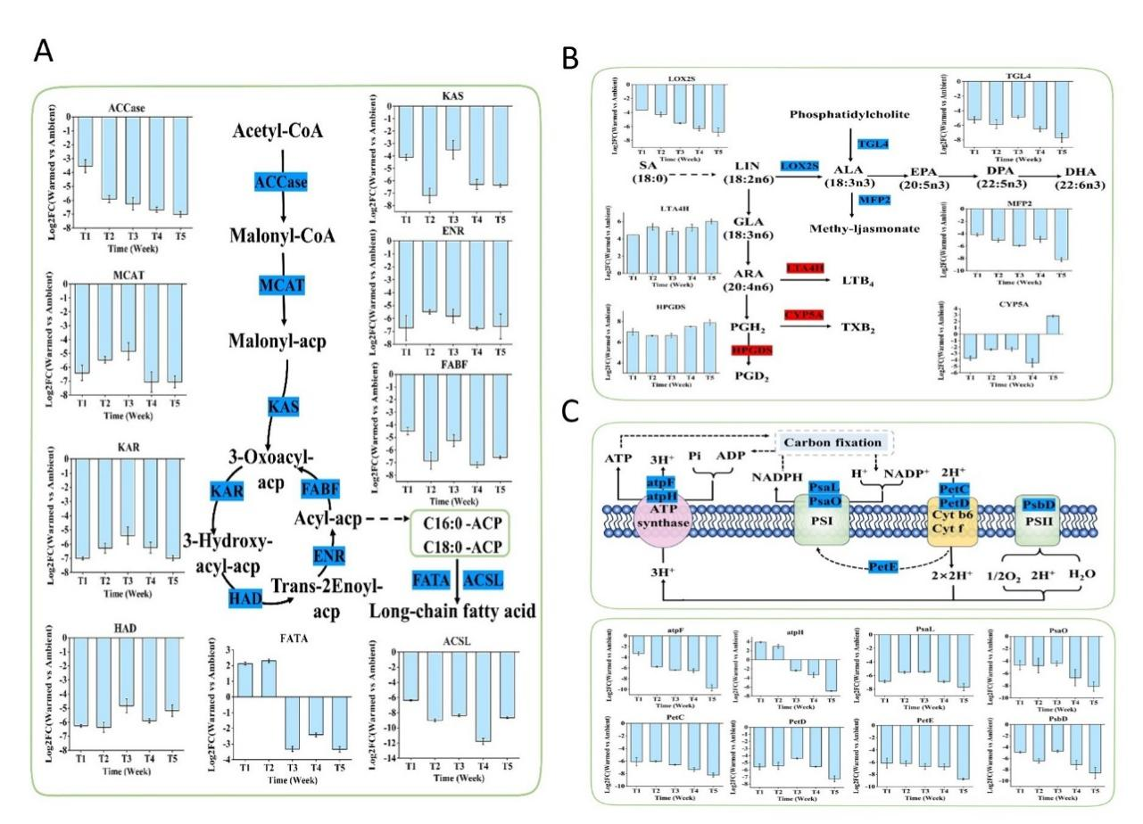 中国科学院武汉植物园系统生态学研究组硕士生钱正禄,在谭香研究员和张全发研究员的指导下,通过开展中宇宙实验,研究升温(升高4°C)如何影响基础资源附石生物脂肪酸组成及向消费者的传递。 结果表明:变暖导致PUFA和长链PUFA(LC-PUFA, >20 C)在附石生物中的比例分别从 13.32%降低到9.90%,以及从3.05%显著降低到 2.18%。三种PUFA 的比例——α-亚麻酸(ALA, 18:3ω3)、花生四烯酸(ARA,20:4ω6)和二十二碳六烯酸(DHA, 22:6ω3)的比例也显著下降(p<0.05)。初级消费者的脂肪酸谱反映了基础资源的变化,其pufa从40.14%>
