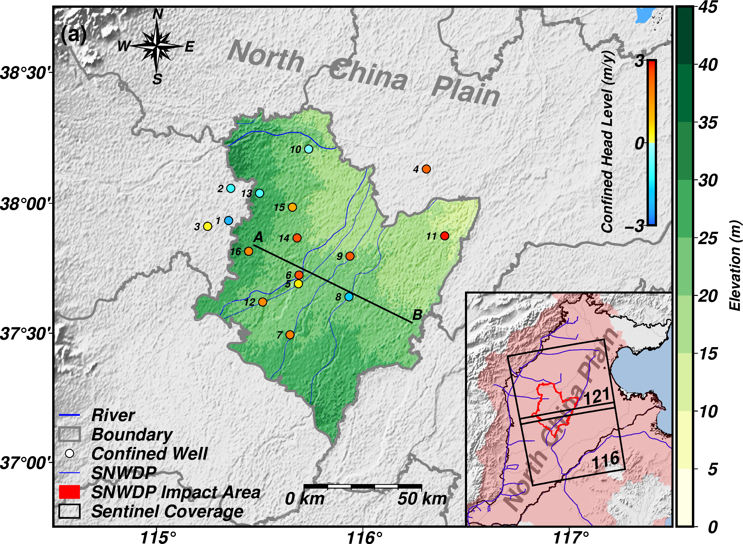 研究区域位置(包含区域地质特征、承压水井数量、Sentinel卫星数据覆盖范围)