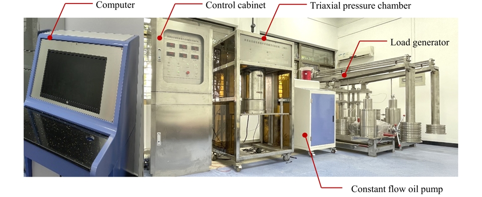 对此,武汉岩土所油气中心科研团队研发了岩石超低频循环荷载蠕变试验系统(图2),该系统由五个主要部分组成:荷载发生系统、三轴压力室、应力应变监测系统、计算机和自动补排油系统。试验系统采用重力驱动式“动静结合”加载技术。通过固定砝码实现恒定静载,可移动砝码生成循环动载,有效突破了传统电液伺服系统和重力加载方式在长周期循环试验中的技术限制。此试验系统具有控制性能好、自动化程度高、试验精度高、稳定性好等诸多优点,最大的优点是在开展长期的蠕变试验中具有极高的稳定性,同时支持自定义循环荷载的波形和循环周期。