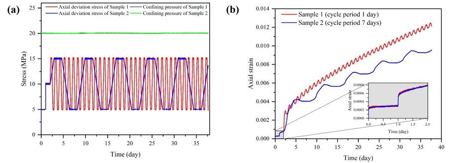 图3 (a)循环周期为1天和7天的低频循环荷载蠕变试验应力曲线; (b) 循环载荷蠕变试验中试样的蠕变曲线
