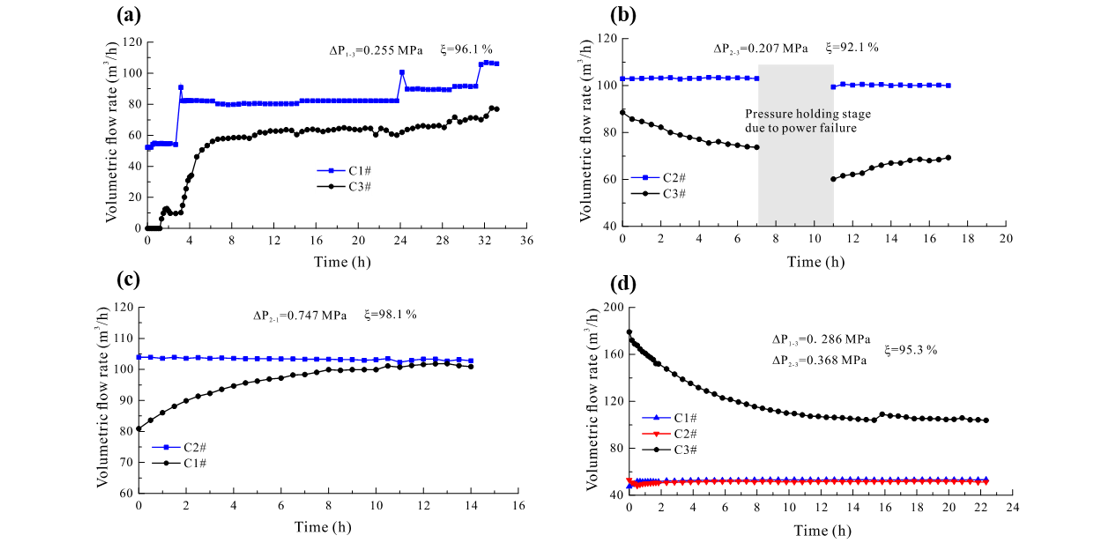 大型现场注卤排卤试验结果(图4)表明,四组试验的注采比均高于92%,表明试验过程中卤水损失量较小。现场试验结果揭示沉渣空隙水力连通性良好,比如,“一注一排”(图2c)试验中沉渣通道长达600 m以上,而卤水沿程压力总损失仅为0.747 MPa(图4c)。沉渣空隙率最高可达40%、渗透率介于10-9至10-11㎡范围。现场试验成果量化了沉渣空隙连通性和可储能力,论证了利用盐矿沉渣空隙储气这一设想,突破了高杂质盐矿建库瓶颈,消除了各界对于利用盐矿沉渣空隙储气的疑虑,极大提高了库容和盐矿资源的利用率。