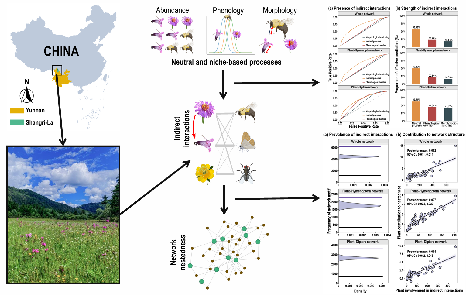 论文“Disentangling the mechanisms behind indirect interactions between plants via shared pollinators: effects of neutral and niche-based processes”发表在生态学期刊Journal of Ecology,博士研究生何勇登为第一作者,叶忠铭副研究员与杨春锋研究员为共同通讯作者,西班牙地中海高级研究所Amparo Lázaro研究员,巴西圣保罗州立大学Pedro J. Bergamo助理教授和武汉植物园梁欢助理研究员参与了该工作。研究得到国家自然科学基金(32570275、32470241、31970253、32170241、32270243)资助。