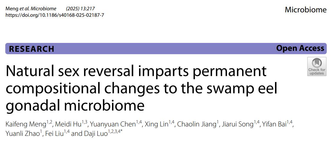 近日,该团队以“Natural sex reversal imparts permanent compositional changes to the swamp eel gonadal microbiome”为题在微生物学领域国际期刊Microbiome发表了最新研究进展。