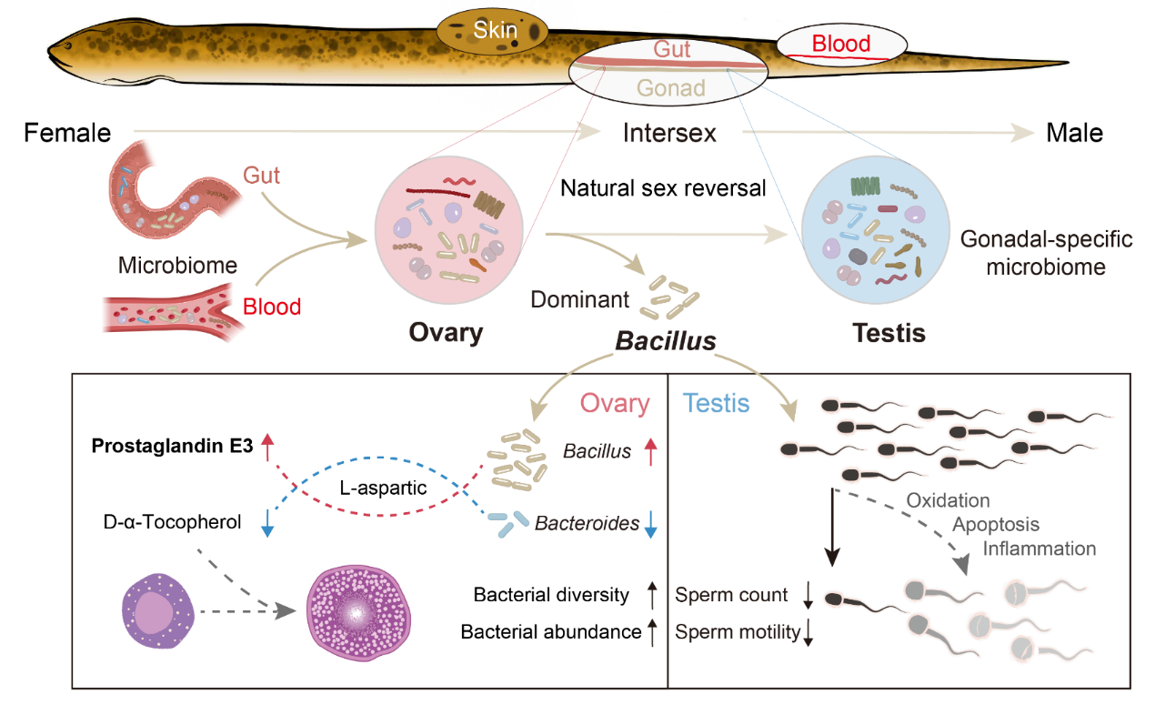 该团队报道了黄鳝卵巢和精巢中的细菌微生物群落特征,通过与肠道、皮肤和血液三个不同生态位中微生物群落进行比较分析和溯源,发现了黄鳝性腺菌群主要来自于肠道和血液。随后,他们重点关注了卵(精)巢优势菌,最终成功分离和培养了黄鳝卵巢优势细菌芽孢杆菌。又通过在体注射芽孢杆菌的动物实验,结合组织学、细胞/分子实验和组学等发现芽孢杆菌有助于维持黄鳝卵巢生理功能;相反,过量的芽孢杆菌导致精巢的炎症反应并抑制了雄性黄鳝精子活力,导致精子数量减少等损害精巢功能。该研究揭示了卵巢优势细菌芽孢杆菌在雌雄同体黄鳝性腺中的双向调控功能,提示了卵巢和精巢优势菌在性反转中的重要功能(图1)。这些结果一定程度上从性腺共生菌稳态角度回答了“黄鳝性反转为什么往往发生在第一次排卵后?”的问题,为深入解析黄鳝性反转自然发生的影响因素探索了新方向,也为开发益生菌定向诱导黄鳝性别提供了新思路。
