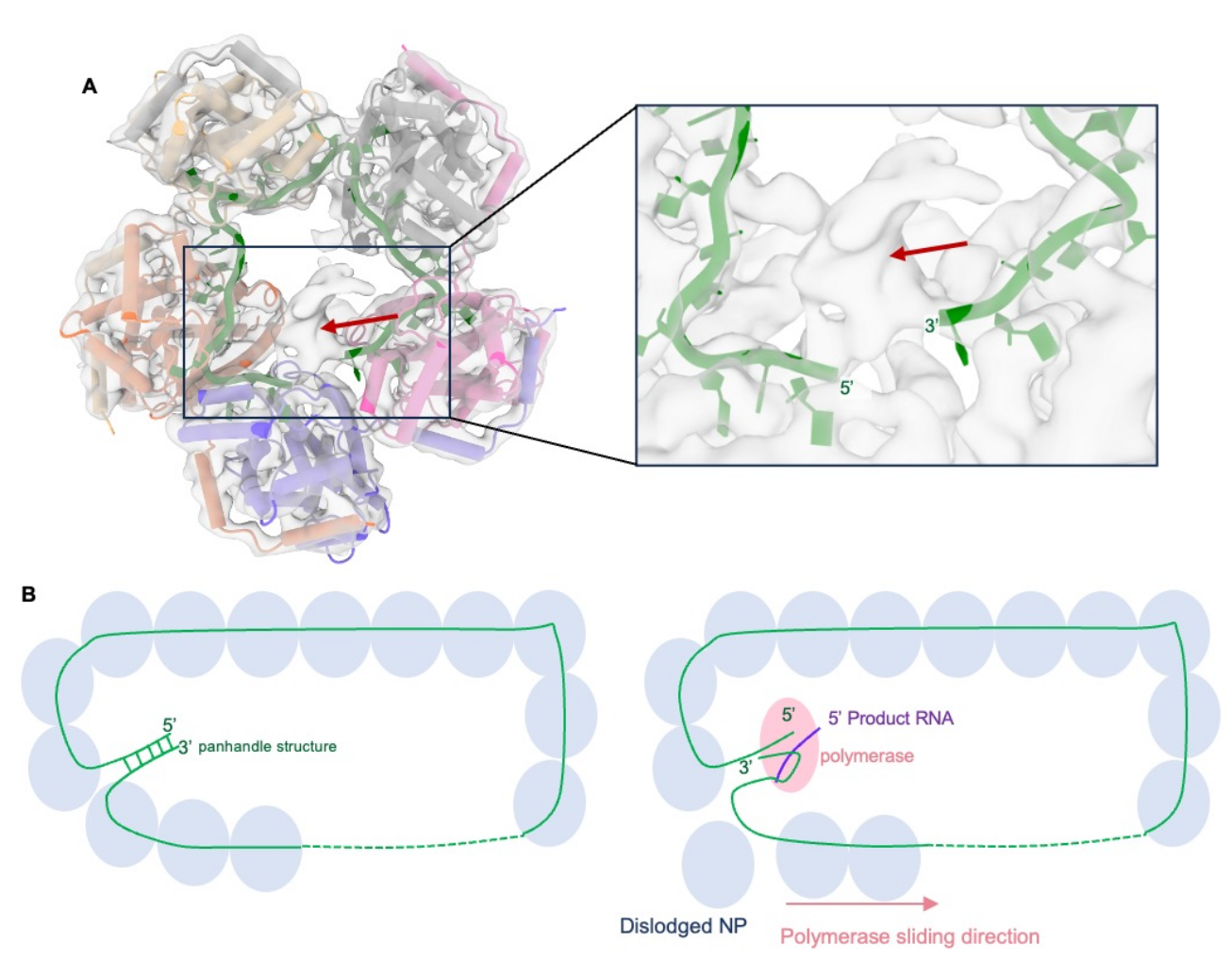 对同科154个病毒NP蛋白的保守性分析显示,其RNA结合沟槽高度保守,提示该科病毒NP可能采用类似的RNA结合机制,并具有作为广谱抗病毒靶点的潜力。在冷冻电镜密度中,可观察到一段未建模的密度将RNA的5′端和3′端连接起来,这段密度很可能对应RNA的未建模末端区域。如果这些末端序列相互互补,它们可能形成RNA双链结构。布尼亚病毒各基因组片段的5′端和3′端在同一病毒种内高度保守,并具有较强的互补性,可能形成“锅柄”(panhandle)状的双链茎结构,使病毒基因组片段形成环状。基于此,该研究提出了SFTSV RNP组装模型(图1)。SFTSV RNP可能通过RNA的“锅柄”结构及NP-NP相互作用形成环状构象。病毒RNA聚合酶通过识别该锅柄结构来启动RNA合成。在延伸过程中,靠近复制中心的NP暂时解离,使包裹的基因组RNA暴露出来,从而被RNA聚合酶识别。同时,NP通过其柔性的N-arm维持空间定位。当RNA聚合酶通过后,暂时脱离的基因组RNA会重新被NP包裹。