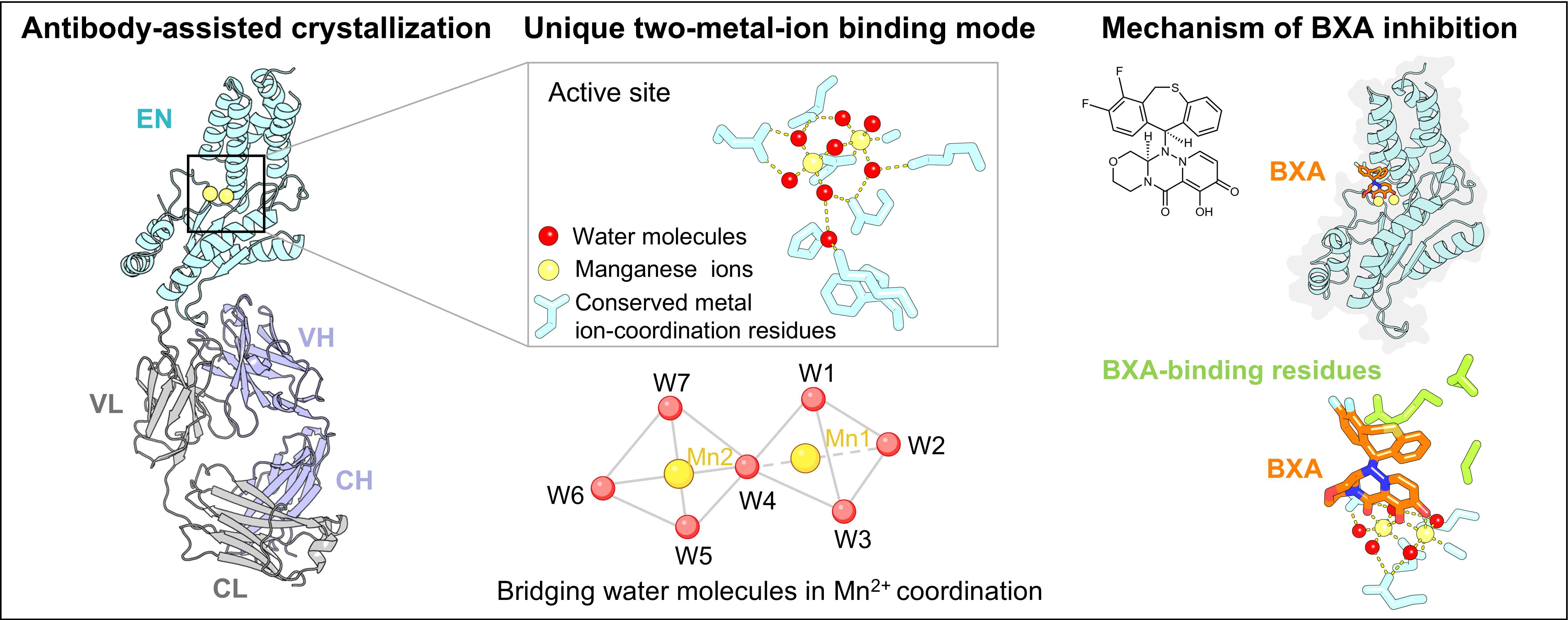 该研究以CCHFV及其近缘病毒Kasokero virus(KASV)核酸内切酶为研究对象,系统开展了生化活性表征、晶体结构解析及功能验证实验。研究发现,CCHFV和KASV核酸内切酶在锰离子存在时表现出显著的核酸切割活性,并对富含尿嘧啶的RNA底物具有明显偏好。此外,研究还评估了多种已知核酸内切酶抑制剂的效果,其中包括已获FDA批准的抗流感药物巴洛沙韦酸。结果表明,该小分子能够有效结合并抑制CCHFV和KASV核酸内切酶的活性。研究团队进一步采用抗体辅助结晶策略,成功解析了CCHFV和KASV核酸内切酶在游离状态、KASV核酸内切酶在金属离子结合状态以及抑制剂结合状态下的多种高分辨率晶体结构。结构分析显示,KASV核酸内切酶活性中心的两个锰离子通过保守氨基酸和多分子水桥共同参与结合,这一金属离子配位模式对酶活性至关重要。进一步的细胞水平实验表明,破坏这些金属离子结合位点可几乎完全抑制病毒聚合酶的转录活性,证明了该金属离子配位模式在病毒转录过程中的关键作用。KASV核酸内切酶与小分子抑制剂的高分辨率晶体结构还揭示出其活性口袋相对开放的结构特征,为后续基于结构的药物改造和优化提供了明确方向。