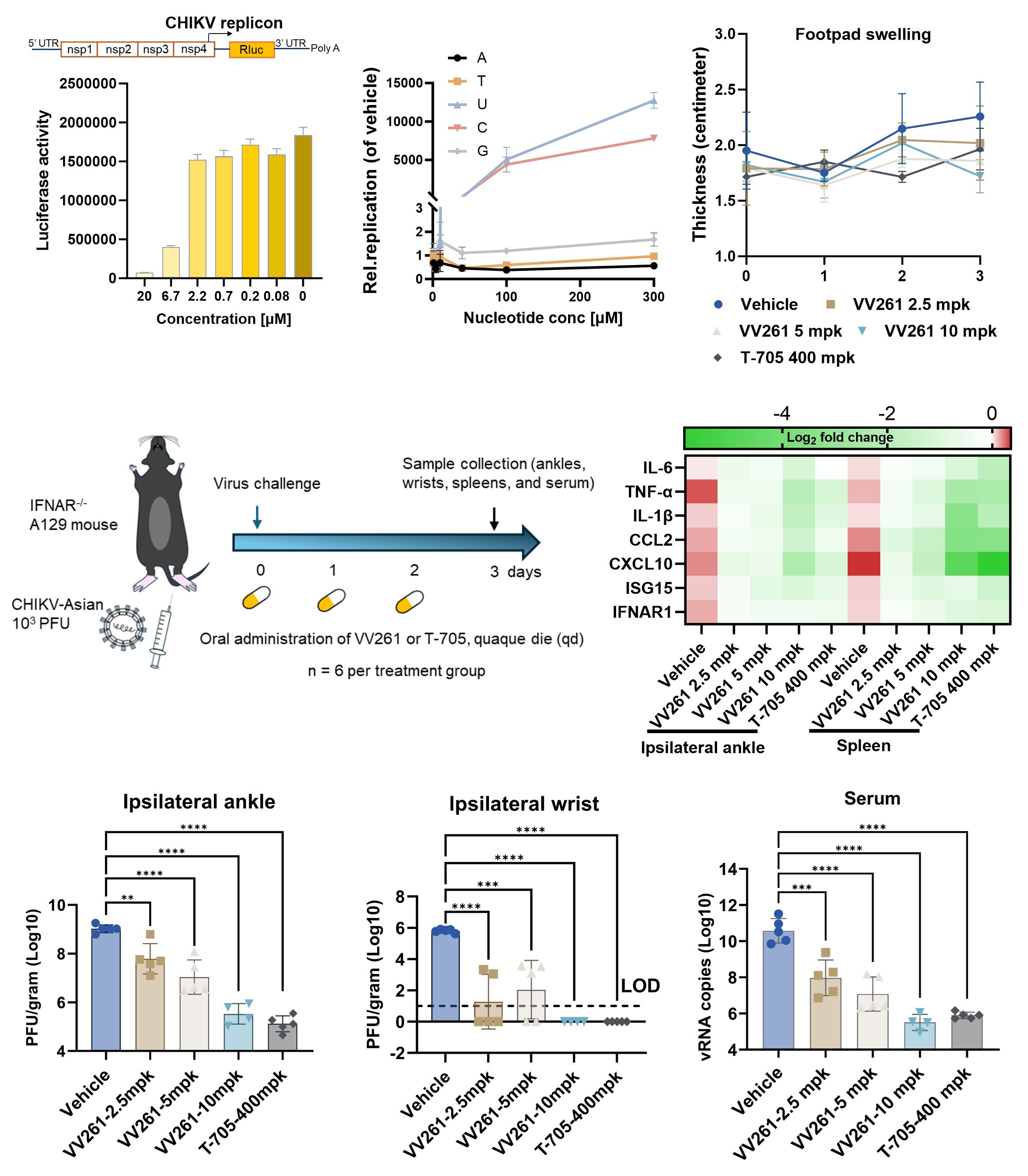 由基孔肯雅病毒引起的基孔肯雅热是一种蚊媒传染病,近年来我国多次出现输入病例引发的聚集性疫情,且自2025年后该病毒本土传播风险进一步上升。基孔肯雅热的症状以关节痛、肌痛及长期慢性关节炎为主要表现,部分患者症状可持续数月甚至数年,严重影响生活质量和劳动生产力,相关的抗病毒药物研发是全球关注的重点。中国科学院武汉病毒研究所肖庚富/张磊砢团队通过荧光工具病毒构建了体外抗病毒快速筛选体系,从核苷类化合物库中筛选到核苷前药分子VV261能有效抑制病毒在细胞中的增殖,且一日一次口服给药能显著降低A129小鼠的关节组织和血清中的病毒载量及炎症水平。在进一步研究中发现,化合物VV261能模拟天然嘧啶掺入病毒基因组,与抗病毒药物法匹拉韦(T-705)的抗病毒机制不同,其通过非突变积累的方式干扰病毒复制。