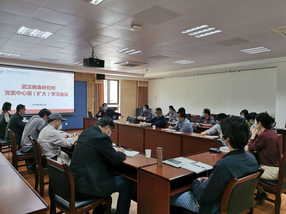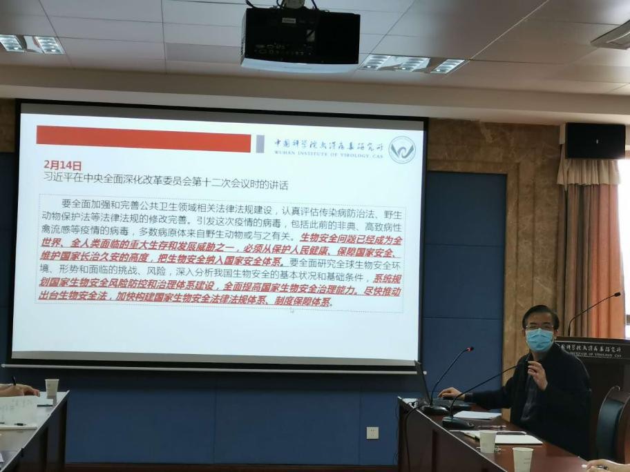 4月27日下午,中国科学院武汉病毒研究所党委召开中心组(扩大)学习会议,专题学习习近平总书记关于生物安全的重要讲话精神,并对中国科学院生物安全大科学研究中心建设进行了充分讨论。党委书记、副所长肖庚富主持会议,领导班子成员、党委委员、所长助理、在职各党支部书记、研究生党总支书记参加会议。