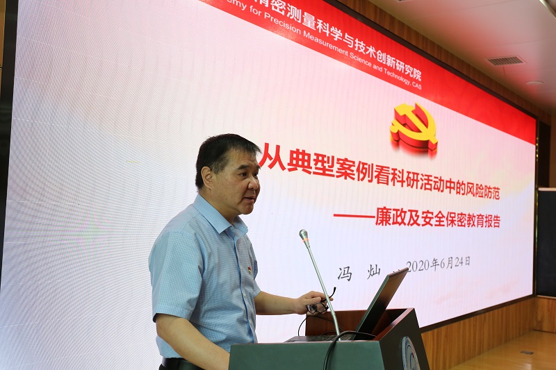 党委书记冯灿作题为《从典型案例看科研活动中的风险防范——廉政及安全保密教育报告》党课报告。报告结合李宁等贪污案、北京交通大学“12·26”爆炸事故、某科研院所失泄密事件等典型案例,重点阐述了科研经费使用、实验室和科研生产安全、保密管理等风险及防控。在介绍基本案情、深入剖析原因、总结案例启示的基础上,对做好相关工作提出了要求。冯灿强调,要提高政治站位,准确把握形势,清醒认识问题,增强做好全面从严治党、党风廉政建设和反腐败工作的紧迫感责任感使命感,切实提高对科研经费公有属性的认识,防范科研经费使用的违纪违法风险,正确认识“放管服”,珍惜每一分科研经费,好钢用在刀刃上;要切实强化责任担当,强化“红线”意识、底线思维,坚持警钟长鸣,确保安全保密责任到位、制度到位、教育培训到位、安全检查到位、隐患治理到位,努力构建“平安园区”,保障精密测量院科技创新工作健康和高质量发展。冯灿希望,广大党员科研人员深入学习习近平总书记给25位科技工作者代表的回信精神,坚持创新是引领发展的第一动力,弘扬新时代科学家精神和优良作风学风,勇做重大科研成果的创造者、建设科技强国的奉献者、崇高思想品格的践行者、良好社会风尚的引领者。