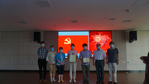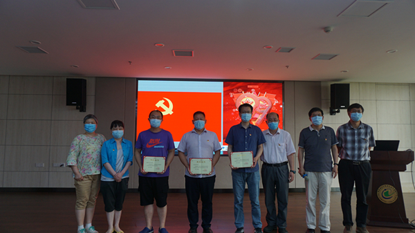 党委书记陈丹宣读《中共中国科学院武汉文献情报中心委员会关于表彰2019—2020年度先进党支部、优秀共产党员和优秀党务工作者的决定》和《中共中国科学院武汉文献情报中心委员会关于表彰2019年度党支部特色活动的决定》,综合管理党支部、离退休党支部荣获先进党支部荣誉称号,吕新华、刘金铃、李艳、张秀梅、邵荣、周伯柱、徐雯、郭清方、熊奇永等9名同志荣获优秀共产党员荣誉称号,周晓芳、裴攀荣获优秀党务工作者荣誉称号。综合管理党支部“建国建院七十周年系列党课”活动获一等奖,数据平台中心党支部“党员政治生日”活动获二等奖,学习传播中心党支部“‘不忘初心、砥砺前行’微党课”活动获三等奖。中心领导依次为获奖者颁发荣誉证书。优秀党员代表张秀梅和优秀党务工作者裴攀分别发言。