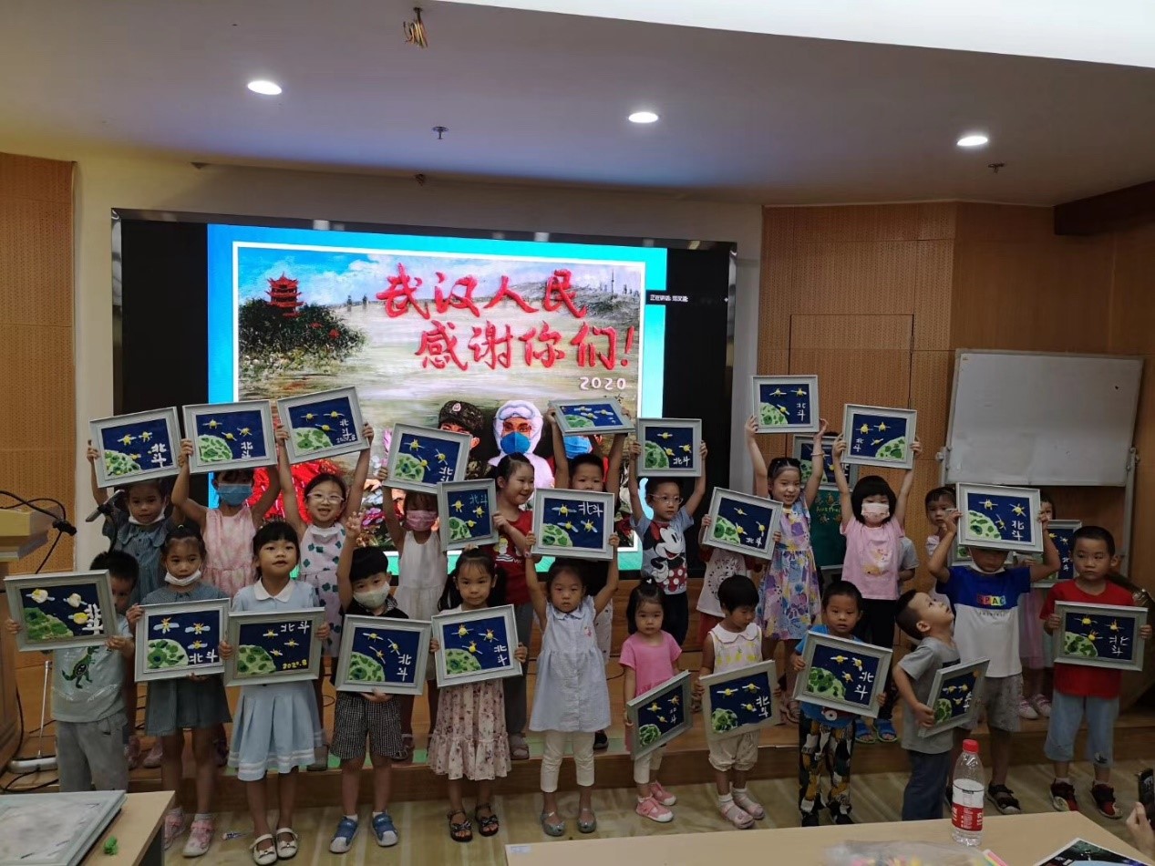 随后,七彩土艺术指导中心的老师带孩子们一起制作北斗主题黏土画。在手工环节,孩子们在学到北斗知识的同时,利用眼睛,理解能力和动手能力完成一幅北斗卫星围绕地球运行的黏土作品,劳逸结合,收获满满。