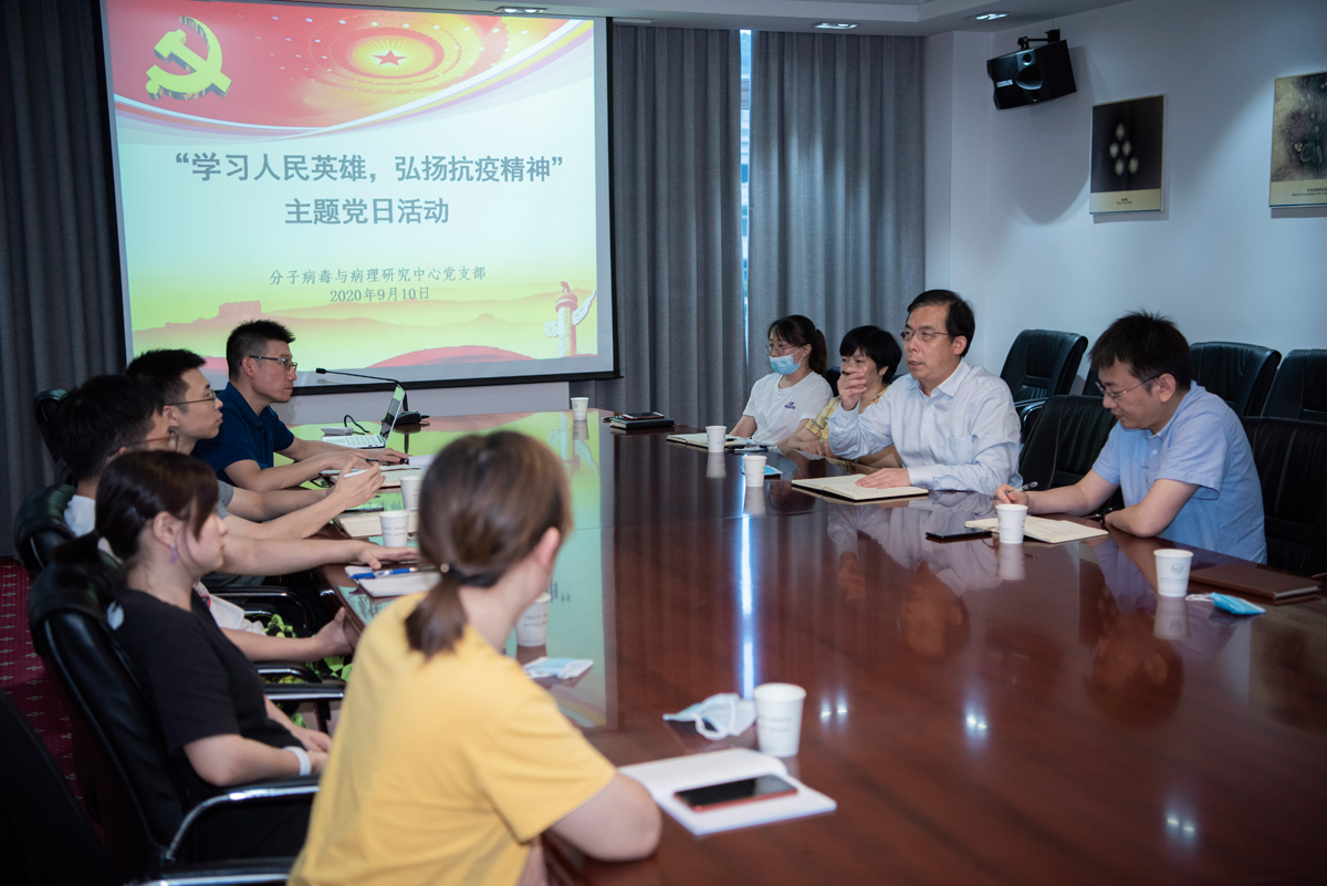 9月10日,中国科学院武汉病毒研究所分子病毒与病理研究中心党支部开展“学习人民英雄,弘扬抗疫精神”主题党日活动,认真学习习近平总书记在全国抗击新冠肺炎疫情表彰大会上的重要讲话,向英雄致敬,将抗疫精神内化于心,为实现“两个一百年”的目标而努力奋斗。分子病毒与病理研究中心党支部全体党员参加了会议。会议由党支部书记彭珂主持。