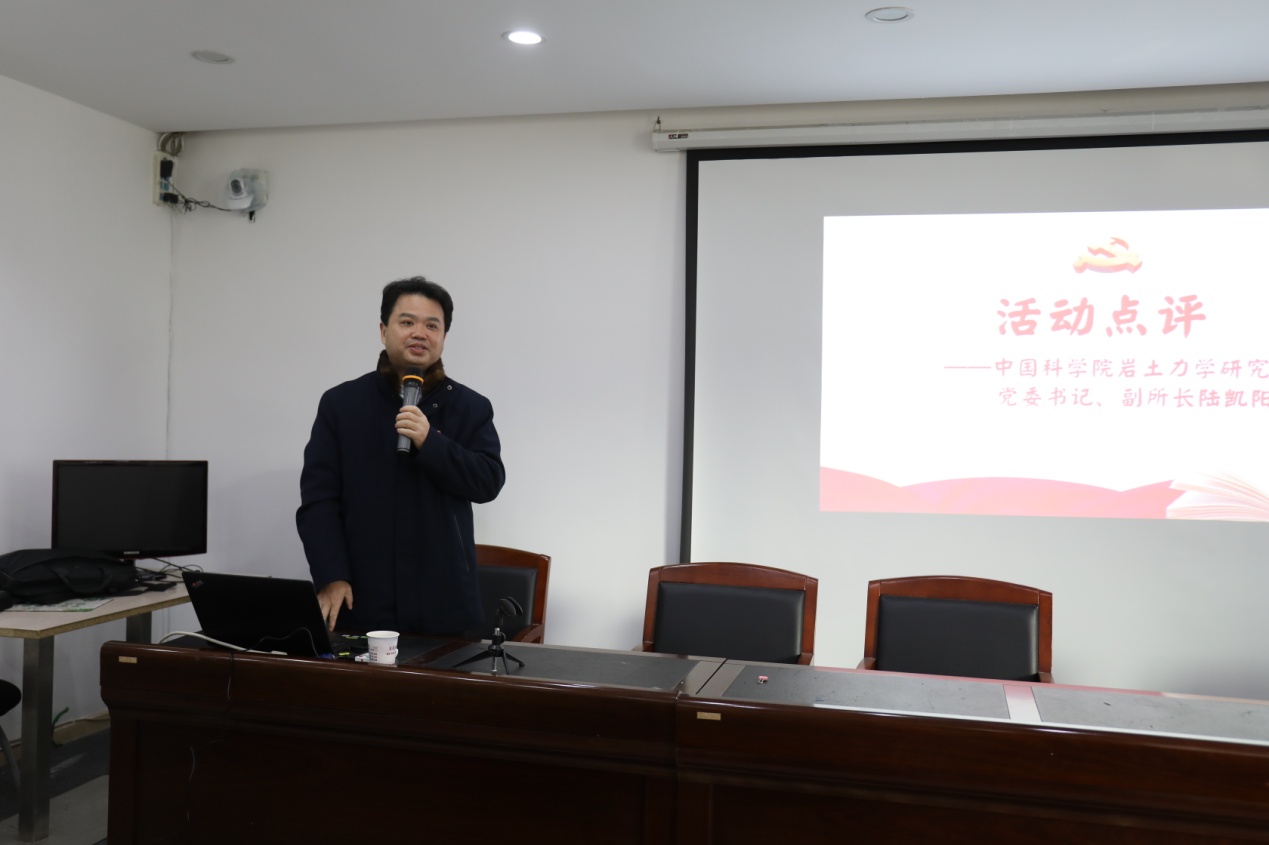 岩土所党委书记、副所长陆凯阳在总结点评中对茶港社区长期以来对岩土所的帮助和支持,特别是在疫情期间为保障居民生活付出的努力和牺牲表达感谢。他对于本次主题党日活动成效给予充分肯定,指出与会党员在宣誓、诵读中唤醒了入党初心,增强了党性观念,在集中学习中提高了政治站位,坚定了理想信念,强调要将活动成效转化为推动发展的实际行动,发挥党员先锋模范作用和支部战斗堡垒作用,以高质量党建推动高质量发展。他认为每名党员都应该立足岗位,做好本职工作,科研院所的党员肩负科技报国的使命,更要仰望星空、脚踏实地,坚持“四个面向”,坚守“创新科技、服务国家、造福人民”的科技价值观,牢记国家战略科技力量的使命责任,在创新工作中对标对表,将论文写在祖国大地上,在推动创新事业发展中践行“两个维护”。