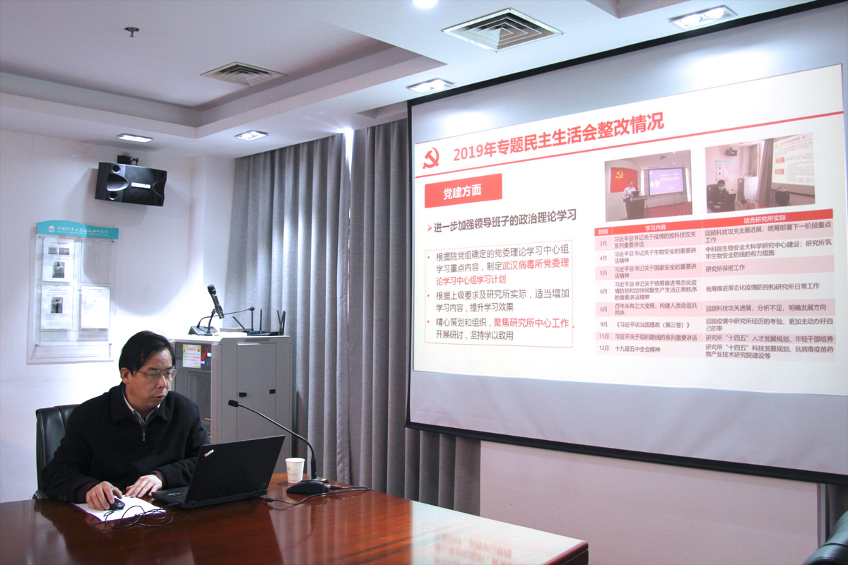 根据院党组和分院分党组关于召开2020年党员领导干部民主生活会的有关要求,武汉病毒所领导班子和党员领导干部聚焦“认真学习贯彻习近平新时代中国特色社会主义思想,加强政治建设,提高政治能力,坚守人民情怀,夺取决胜全面建成小康社会、实现第一个百年奋斗目标的伟大胜利,开启全面建设社会主义现代化国家新征程”主题,深入学习习近平新时代中国特色社会主义思想、党的十九届五中全会精神和习近平总书记系列重要讲话精神,并根据要求,认真开展会前准备工作。结合研究所生物安全大科学中心建设,所党委通过设置征求意见箱、在全所范围内发放调查问卷,召开青年职工代表座谈会、退休党支部支委会、研究生代表座谈会,对党外代表人士个别征求意见等方式广泛征集职工对领导班子、班子成员及研究所发展的意见和建议。领导班子和班子成员围绕此次民主生活会的主题,在认真学习的基础上,深入开展谈心谈话,针对调查问卷统计结果和职工提出的意见和建议,结合个人思想和工作实际,开展深刻的自我剖析,形成个人发言提纲,并在此基础上撰写了领导班子对照检查材料。