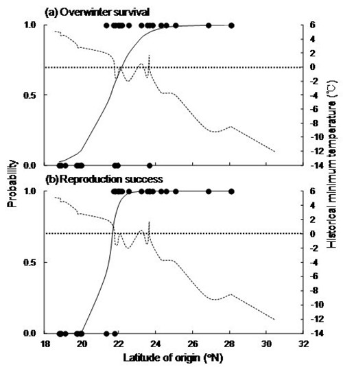 普通野生稻北部同质园移栽种群的(a)越冬存活率和(b)有性繁殖成功率与其来源纬度之间的关系。虚线表示各位点自然种群的历史冬季最低温。在第二个生长季初始时出现一片或多片绿叶就认定该植株成功越冬。每个种群出现一个或多个植株抽穗的情况就认定为有性繁殖成功。