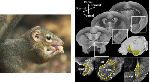 中国树鼩(左图)的高分辨脑解剖磁共振图像(右)。黄色虚线勾勒的区域为杏仁核。