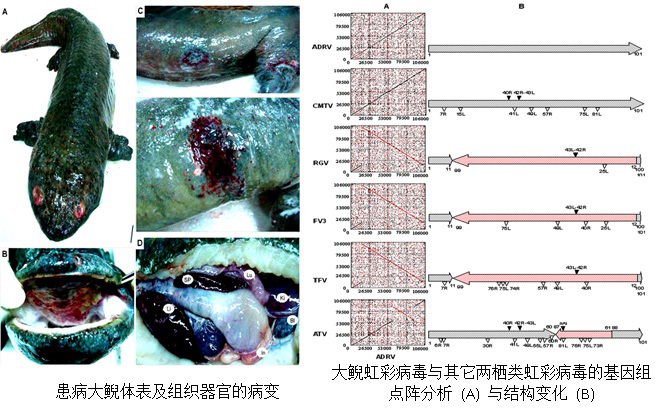 近日,中国科学院水生生物研究所张奇亚研究员、桂建芳研究员和南昌大学洪一江教授联手就大鲵虹彩病毒的全基因组序列及其结构变化开展研究,在新分离鉴定导致大鲵致死性出血病病原——大鲵虹彩病毒 (Andrias davidianus ranaviurs, ADRV) 的基础上,测定了其全基因组序列,并与已知两栖类蛙虹彩病毒基因组进行点阵及结构变化分析。结果显示,ADRV基因组全长为106,734 bp,可编码101个开放阅读框,其中含虹彩病毒家族26个核心基因、蛙病毒属成员24个特有基因及两栖类蛙病毒亚属的11个特有基因;发现几个涉及病毒毒力及宿主感染性的关键基因发生显著变化。进而指出,在大鲵虹彩病毒基因组中有明显变化的这些基因可在削弱或改变宿主抗病力、增强ADRV致病性以及跨种传播中起关键作用。该研究不仅首次揭示导致大鲵自然种群衰减与养殖群体疾病频发的虹彩病毒分子特征,也为深入了解这类病毒流行和基因组进化规律、以及研发两栖类病毒病免疫防控技术提供了新的研究思路。