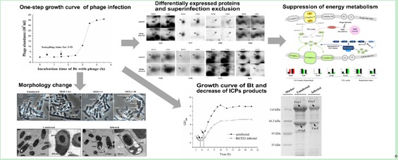 近年来,武汉病毒所高梅影研究员学科组在芽孢杆菌噬菌体研究领域取得了系列研究成果。其团队完成了来源于苏云金芽孢杆菌的第一株长尾噬菌体科噬菌体BtCS33的基因组测序和分析(PloS One 2012 7(5): e37557);探索了BtCS33产生的裂解酶在防治炭疽芽孢杆菌和蜡样芽孢杆菌中的应用潜力(BMC Microbiology 2012 12:297);首次采用比较蛋白质组学,研究了噬菌体BtCS33的宿主菌CS33对噬菌体侵染的应答反应,并发现了BtCS33通过掠夺宿主菌生命活动系统中的一些组分来完成其自身复制过程的机制(Journal of Proteomics, 2014 101:192-204);分析了BtCS33和另一株Bt长尾噬菌体科噬菌体phiCM3的进化关系,并揭示了该类噬菌体基因组的差异进化现象(Journal of General Virology 2014 95:751-761);开展了生姜根茎腐烂病病原菌短小芽孢杆菌的噬菌体研究工作,首次发现噬菌体编码的质粒分离系统相关蛋白调节噬菌体假溶源现象的机制,并研究了噬菌体疗法在防治短小芽孢杆菌导致的生姜病害中的应用潜力。近日,该成果在线发表于应用微生物学研究领域重要刊物Applied and Environmental Microbiology(doi:10.1128/AEM.02889-14)。