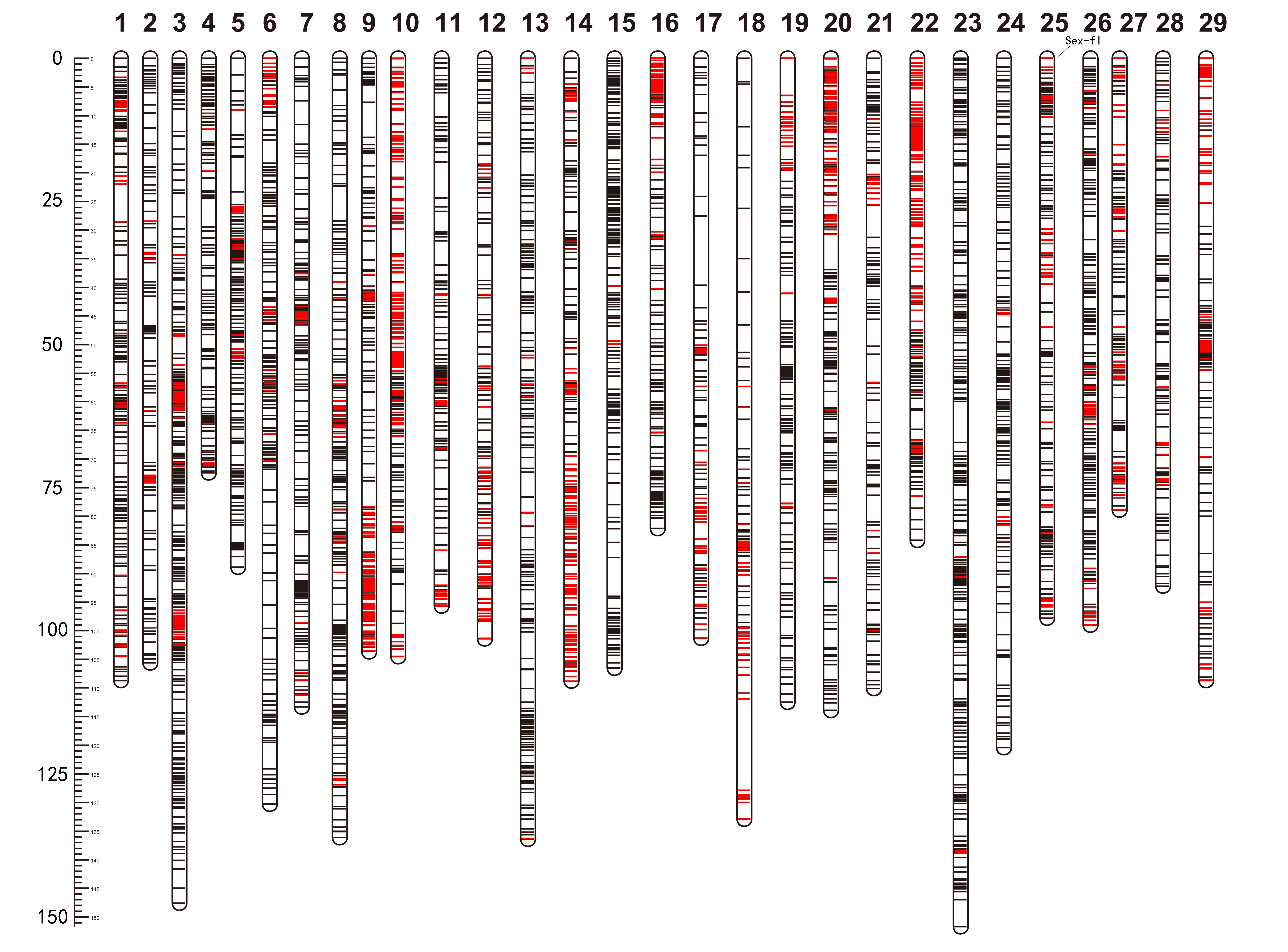 中国科学院武汉植物园猕猴桃资源与育种学科组助理研究员张琼在研究员黄宏文的指导下,采用山梨猕猴桃和中华猕猴桃种间杂交群体,利用基于第二代测序的RAD-seq技术构建猕猴桃种间高密度遗传连锁图谱。父母本图谱中各有29个连锁群(2X=58),分别包含4214和2426个SNP标记。该图谱能将猕猴桃基因草图中无法组装的440个Scafflold锚定到基因组上,极大提高基因组组装水平。猕猴桃种间高密度遗传图谱不仅为猕猴桃基因组序列精细组装提供了重要参考,并为开展猕猴桃优异性状的QTL定位研究,挖掘相关候选基因奠定了基础。同时,将群体性别表型标记定位在图谱上,锁定性别相关区段在第25号染色体端粒位置,并开发3个性别鉴定标记,用于猕猴桃植株早期性别筛选,利于猕猴桃分子辅助育种。