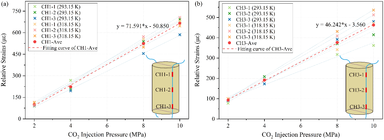 图1表面粘贴两根FBG传感器(a)CH1和(b)CH3监测不同温度压力条件下CO2注入诱导岩芯表面相对应变响应