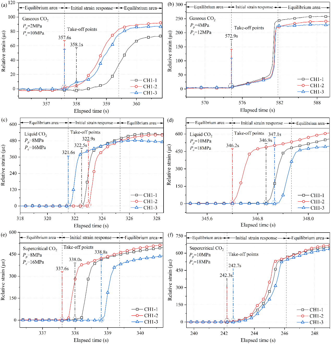 图2光纤布拉格光栅传感器CH1在恒定有效围压8 MPa下监测岩芯表面三个光栅初始应变响应时间差。(a)~(b)气态CO2注入后光栅应变响应及时间差;(c)~(d)液态CO2注入后光栅应变响应及时间差;(e)~(f)超临界CO2注入后光栅应变响应及时间差。