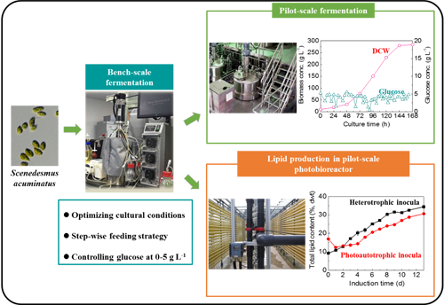 中国科学院水生生物研究所研究人员以一株可异养培养的富油栅藻为研究对象,通过过程优化,尤其是精准的葡萄糖浓度控制这一关键技术的突破,实现了该藻的超高密度培养——在实验室和中试发酵罐放大条件下,栅藻最高细胞干重分别达到286和283.5 g/L,为目前国际上报道的最高微藻培养生物量浓度水平,且已远高于所有已知的工业微生物(细菌和酵母)的最高生物量水平。