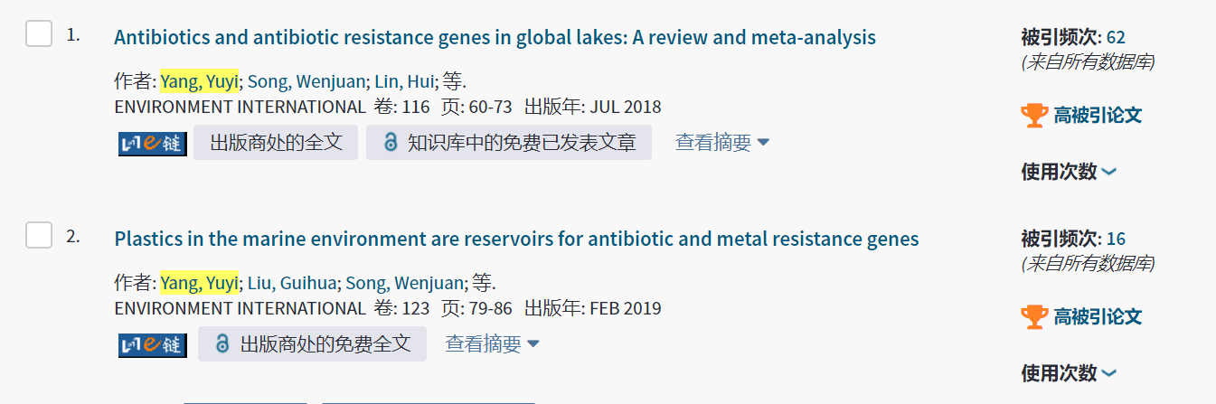 近期,根据Web of Science数据库统计数字显示,武汉植物园环境基因组学学科组杨玉义研究员与湿地生态学学科组刘文治研究员、邢伟研究员等科研人员在Environment International期刊发表的关于水环境抗生素耐药基因领域研究的两篇论文入选环境科学与生态学学科领域全球前1%“ESI高被引论文”(图1)。一篇为综述性论文,该综述通过整理全球湖泊耐药基因研究的文献数据,发现湖泊水体中磺胺类抗生素耐药基因与河流相比含量不存在明显差异,总结了非生物因素(化学污染、湖泊理化指标等)和生物因素(水生生物、耐药菌、细菌群落和可移动遗传元件等)在耐药基因分布和传播中的作用。一篇为研究性论文,以宏基因组学为研究方法,以北太平洋塑料生物膜为研究对象,发现北太平洋中塑料大小对耐药基因相对丰度不存在显著影响;塑料生物膜中耐药基因相对丰度远高于环境水体,渔业病原菌黄杆菌科细菌(Flavobacteriaceae)可能是重要的耐药基因宿主(图2),而且细菌群落结构是影响塑料生物膜耐药基因赋存的重要驱动因子。