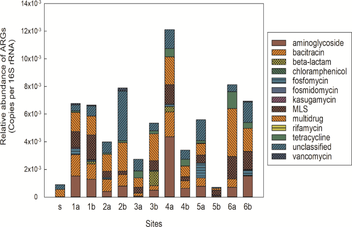 图2 北太平洋海洋水体(S)和塑料样品(a: 大塑料;b: 微塑料,1-6表示不同采样点)中抗生素耐药基因相对丰度图及基于耐药基因与细菌相关性的网络分析图