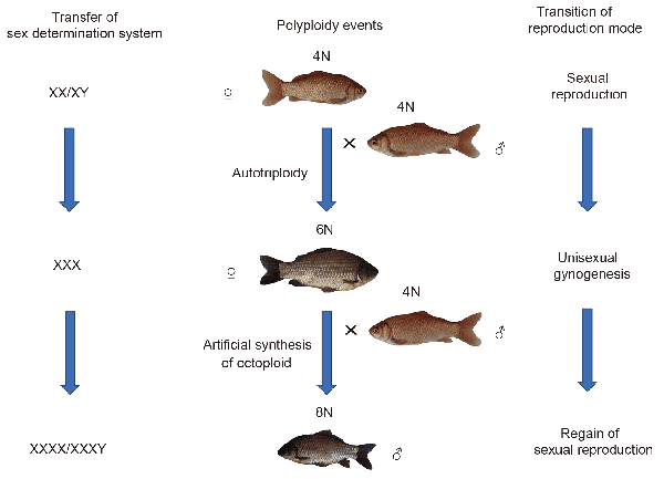 多倍化对于物种的形成和进化起着至关重要的作用。与多倍体广泛存在的植物相比,脊椎动物中的多倍体非常罕见,现今脊椎动物中发现的少量多倍体一般通过单性生殖方式而演化形成。然而,多倍体如何突破生殖瓶颈获得单性生殖能力和其性别决定系统及其生殖方式如何转移和转换尚不清楚。多倍体鲫复合种包含有行两性有性生殖的四倍体鲫(Carassius auratus)和行单性雌核生殖的六倍体银鲫(Carassius gibelio)。银鲫已被揭示是由含有100条染色体的四倍体鲫再次发生一次额外的同源多倍化演化而来,含有150多条染色体;早期研究还发现,它在行单性雌核生殖的过程中还具有整合外源基因组从而形成更高倍性的合成多倍体的潜能。这些四倍体鲫、六倍体银鲫和倍性更高的合成多倍体是研究多倍化后生殖方式转换和性别决定系统转移的理想研究模型。