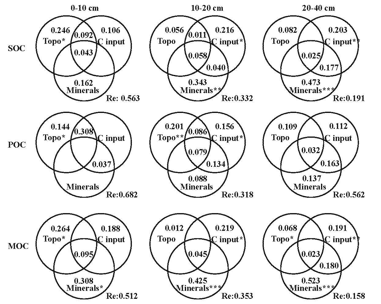 图 地形、外源碳输入和土壤矿质特征对亚热带山地森林土壤总有机碳、颗粒有机碳和矿质结合态碳含量的影响。Topo表示地形特征,C input表示外源碳输入特征,Minerals表示土壤矿质特征(铁铝氧化物)