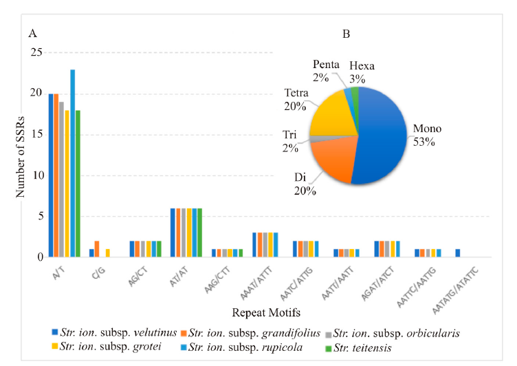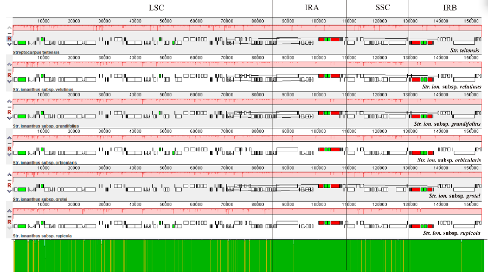 当前,在海角苣苔属Saintpaulia组中仅有一个叶绿体基因组数据被报道,未见到该组中Str. ionanthus的基因组数据信息,武汉植物园博士研究生Cornelius Mulili Kyalo对收集于坦桑尼亚和肯尼亚的Str. ionanthus的五个亚种进行了叶绿体全基因组测序,分别为Str. ionanthus subsp. rupicola,Str. ionanthus subsp. velutinus,Str. ionanthus subsp. grandifolius,Str. ionanthus subsp. orbicularis,Str. ionanthus subsp. grotei,其基因组大小从153,208 bp(Str. ionanthus subsp. grandifolius)到 153,377 bp(Str. ionanthus subsp. orbicularis),均编码115个基因。该研究与Saintpaulia组已报道的Str. teitensis进行比较结果显示,基因的排列顺序,基因组结构均表现出高度保守性,在四分结构中,IR区更为保守(图 1)。研究通过IR边界,以及序列上的微卫星(图 2)等方面的比较,均表现出叶绿体基因组的保守性。