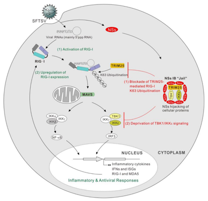 哺乳动物进化出一系列的模式识别受体来识别入侵病原的核酸或者其他保守的分子组分,进而诱导炎症和免疫响应。近期,中国科学院武汉病毒研究所/病毒学国家重点实验室/生物安全大科学研究中心的研究团队发现:尽管宿主细胞具备多种模式识别受体可能识别病毒感染的危险信号,胞浆内的RIG-I模式识别受体在识别SFTSV感染、进而诱导炎症和免疫反应过程中发挥主要的作用,因此RIG-I信号可能在SFTSV感染导致的炎症病理和抗病毒免疫响应中发挥双重作用。另一方面,该团队的研究还发现宿主抗病毒响应反过来可能会在RIG-I本身激活的层面又被病毒特异性拮抗。机制上,SFTSV可通过其非结构蛋白将宿主分子TRIM25(RIG-I激活所需的泛素连接酶之一)特异性“监禁”到病毒包涵体中,有效抑制RIG-I的泛素化激活,从而在RIG-I信号的起始阶段拮抗宿主细胞免疫响应(如下图所示)。该研究不仅揭示了SFTSV感染诱导炎症免疫反应的重要机理,为发热伴血小板减少综合征炎症病理的深入理解提供了线索,同时还阐释了一种SFTSV免疫逃逸的分子机制,丰富了该团队前期提出的病毒“包涵体监狱”假说。