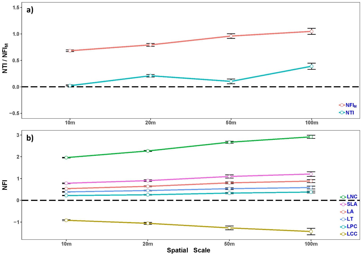 图1:八大公山样地内净最近种间亲缘(NTI)关系指数与净最近功能类群指数(NFI)的尺度效应