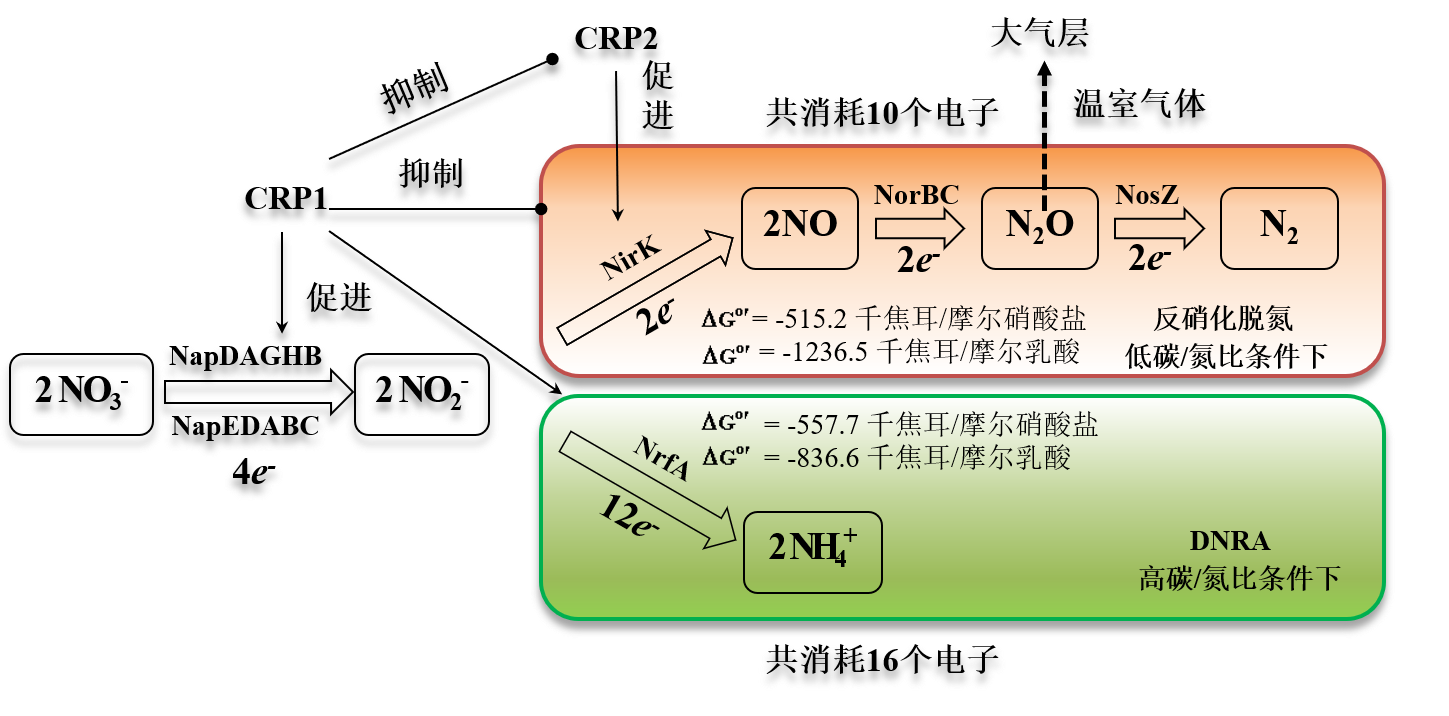 图 罗伊希瓦氏菌中细胞第二信使环状腺苷酸受体蛋白家族成员CRP1和CRP2在高、低碳氮比条件下分别促进异化硝酸盐还原成铵(DNRA)和反硝化脱氮