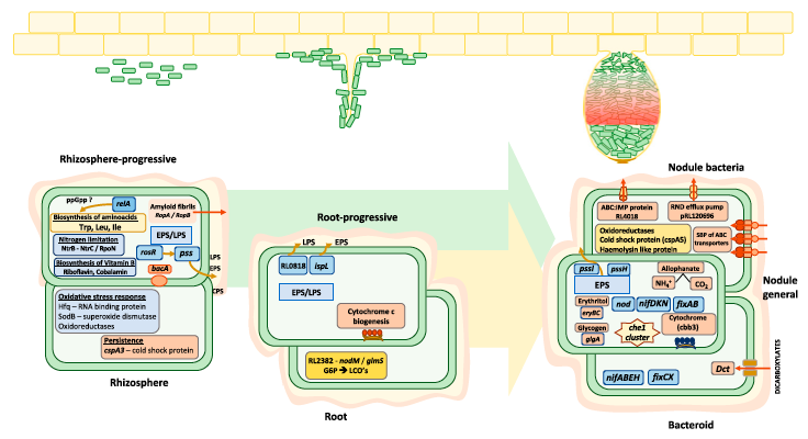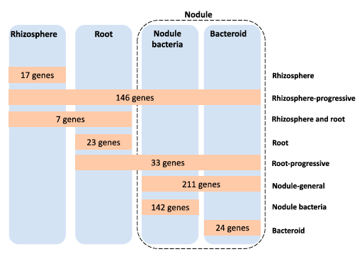 本研究运用Mariner转座子插入测序技术(INSeq)分析了根瘤菌-豆科植物共生过程中的连续生活方式阶段,首次明确了根瘤菌在根际生长、根系定殖、侵染根毛细胞、形成根瘤、分化成固氮类菌体和从根瘤中释放各个阶段的必需基因。虽然只有27个基因被注释为固氮基因(nif和fix),但研究人员发现有603个基因区域是豌豆结瘤和固氮过程中的必需基因。其中,146个基因为根际生长到类菌体发育阶段的必需基因,这些基因凸显了根际环境中的成功竞争对后期侵染及结瘤的重要性;此外,211个基因为结瘤和类菌体阶段的特异基因,主要为菌体运动、细胞膜重组、结瘤信号转导、固氮和代谢适应(包括尿素、赤藓糖醇和醛代谢、糖原合成、二元酸代谢和谷氨酰胺GlnII合成)等功能相关基因。研究结果强调了根瘤菌与宿主豆科植物共生的多个阶段竞争的重要性,为深入了解两者间互作机理奠定了理论基础。