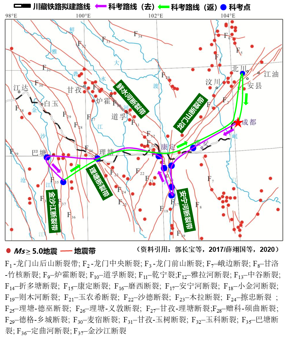 本次科考围绕第二次青藏高原综合科学考察研究任务七“高原生长与演化”专题八“青藏高原不同地块的隆升过程与动力学机制” (负责人:何满潮院士)科考任务展开,以服务川藏铁路建设为科考线路选取原则,行程3500多公里,跨越海拔高度500~4600m,途经天全县、石棉县、泸定县、康定市、雅江县、巴塘县等10个市县,先后考察了川藏铁路沿线发育的龙门山断裂带、安宁河断裂带、鲜水河断裂带、理塘断裂带和金沙江断裂带等区域性活动断裂,及其典型断裂分支,如大川双石断裂、映秀-北川断裂、大渡河断裂、折多塘断裂等。通过现场考察,充分认识了川藏铁路沿线活动断裂带发育特征与构造运动灾害效应,并在科考队地震和地质专家的帮助下,获取了安宁河断裂、金沙江断裂跨断层露头资料,采集了宝贵的断层核、破碎带岩土样品,为进一步揭示跨断层岩土力学特性、隧道变形破坏机理等奠定了基础。