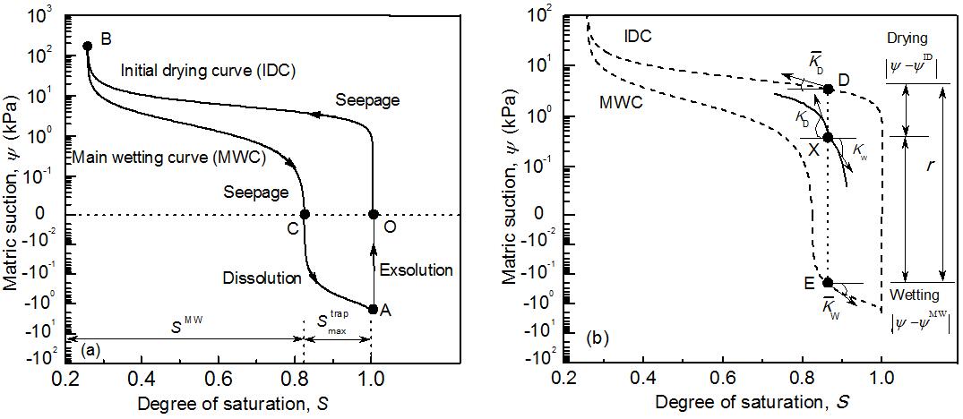非饱和土水特征关系是描述土体中吸力与含水量的关系曲线,是分析非饱和土渗流、污染物迁移、降雨边坡稳定性等问题不可缺少的重要本构关系,一直是非饱和土土力学中研究的热点问题。由于土体孔隙介质的复杂性,土水特征关系具有水力滞回、残余含气量等特性,即含水量与吸力并非单调关系;此外,即使在正孔隙水压力条件下,土体中仍然可存在残留的非浸湿相(如气体)。传统上建立的土水特征关系模型较少考虑水力滞回效应,一些考虑水力滞回影响的土水特征关系模型由于参数较多,确定扫描曲线的迭代计算复杂,未被广泛采用。到目前为止,仍然没有建立能够描述正孔隙水压力(负基质吸力)范围内的土水特征关系数学模型。