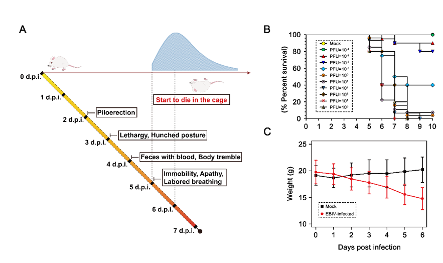 图1:艾比湖病毒感染6-8周龄Bab/c小鼠的疾病进程和临床症状