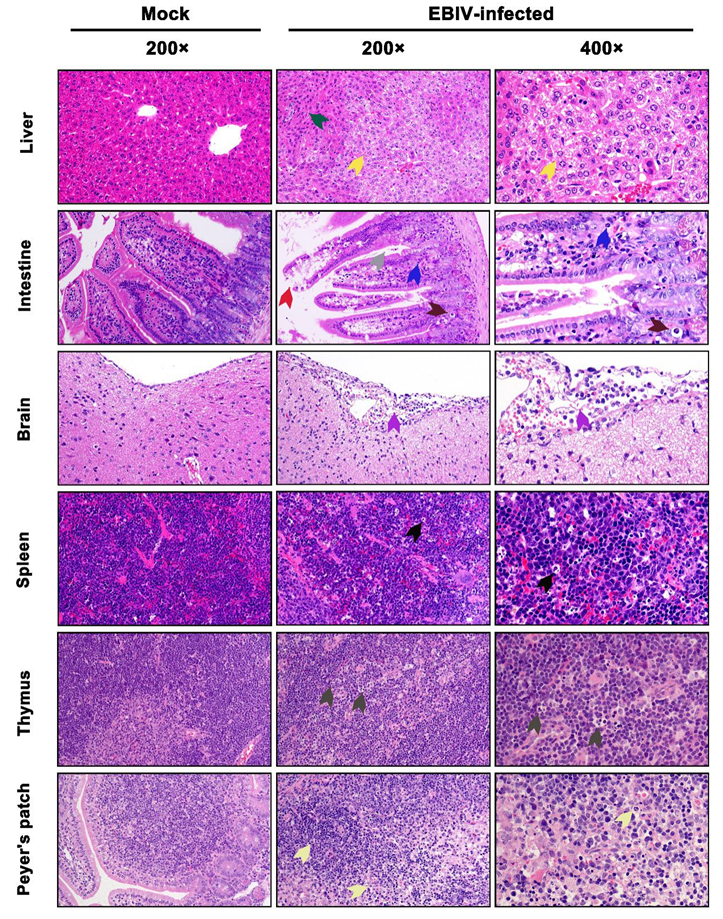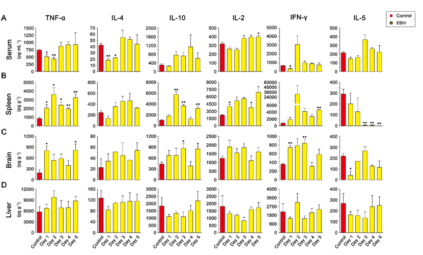 该论文完成了艾比湖病毒感染Balb/c小鼠的发病机理和宿主免疫应答研究。结果表明,小鼠对EBIV高度易感,甚至极低的感染剂量(1 PFU)也对小鼠致死。EBIV感染后,小鼠表现出体重减轻,轻度脑炎等临床症状,并在5-9天后死亡。我们在感染小鼠的周围组织和中枢神经系统中检测到病毒,且在肝脏、脾脏、胸腺和脑中均观察到明显的组织病理学变化。血液成分分析显示感染小鼠的白细胞、血小板减少,ALT、LDH-L和CK明显升高。此外,EBIV感染在小鼠的血清,脾脏和大脑中可引起明显的细胞因子变化。