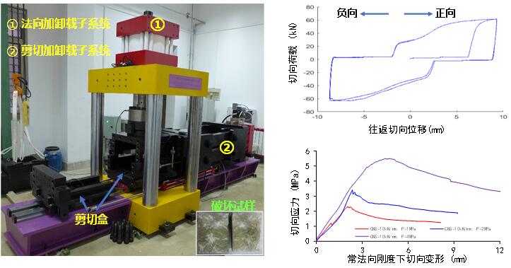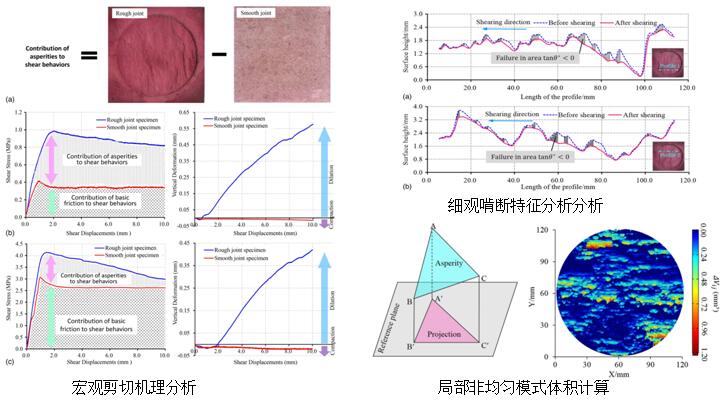 为此,武汉岩土所江权等研究人员重点开展了3方面的研究工作:(1)提出了基于“3S扫描+3D刻录/3D打印”的岩石裂面制样技术,实现工程岩体自然结构面和原位破裂面无损批量制备;(2)通过双连杆推力结构、可视化观测窗口、子母剪切盒结构、双重荷载传感器等技术创新,自主研发具有法向加卸载(NLU)、高常法向荷载(CNL)、高常法向刚度(CNS)、快/慢剪(FLS)、往返剪(GBS)等试验模式的新型多功能岩体剪断/裂面剪切高压伺服剪切试验系统;(3)基于图像处理技术建立了岩体剪切磨损面积和体积的计算方法,发现了剪切过程中硬岩破裂面细观上具有正斜面滑动、陡坎非均匀磨损、凸点局部啃断特征,以及宏观上具有剪切破坏区域分布的局部化和非均匀性特征。
