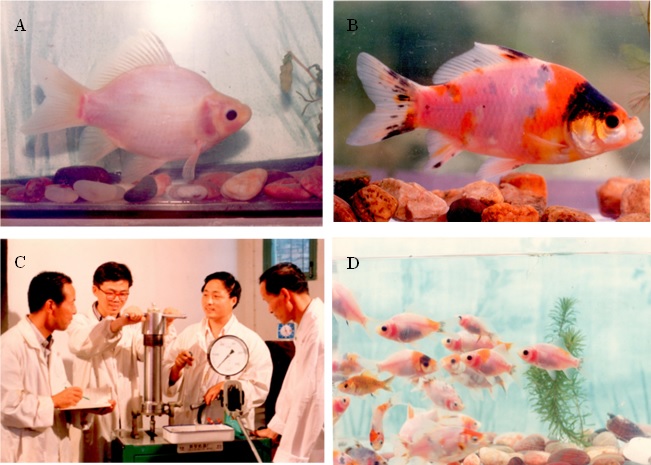 (图A为彩鲫透明鳞突变体,图B为“水晶彩鲫”,图C为桂建芳院士等人操作静水压机,图D为六倍体“水晶彩鲫”)