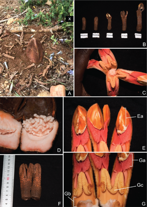 鞭寄生属(Hydnora)是非洲和阿拉伯半岛南部半干旱地区一类无叶的寄生植物,属于被子植物基部类群。目前,该属记载有8种,其中7种在非洲,1种在阿拉伯半岛。本属中,H. abyssinica A.Br. (1)H. africana Thunb分布较广。该属植物被广泛应用于民间医学中,但它们的传统用途和药理价值却鲜有文献记载。武汉植物园东非植物区系与分类学科组研究团队对鞭寄生属物种的分布、民族植物学、化学和药理学等方面进行了文献调研和总结,指出鞭寄生属物种研究领域中存在的空白和不足,对进一步研究其开发利用和保护有重要意义。