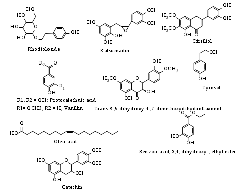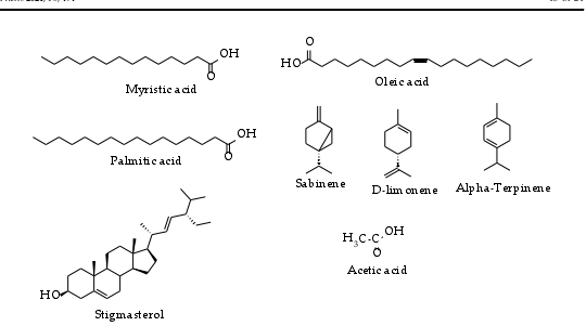 鞭寄生属植物被发现有民族植物学和其他用途。该属植物是野生动物的食物来源之一,尤其是果实。在苏丹,其干燥的根被用于制备木炭和皮革。此外,它与其他药用植物一起用于治疗各种疾病,如瘫痪、糖尿病、发烧、失眠、高血压等。由于它富含单宁,它也常被用作治疗腹泻的传统药物。了解鞭寄生属植物的化学成分和含量是考证其药理学用途的必要条件。目前,仅有几项关于该属植物的药理意义及化学成分的研究。Hydnora abyssinica 是该属中唯一被广泛探索的物种。通过气相色谱-质谱联用法分析了H. abyssinica中少数具有药理作用的化合物,包括豆蔻酸、油酸、棕榈酸、萜烯等(图3)。此外,利用核磁共振阐明了某些组分的结构,如儿茶素、香兰素和原儿茶酸等(图4)。同样,没有对该属其他物种进行植物化学的研究,这是进一步探索的机会。