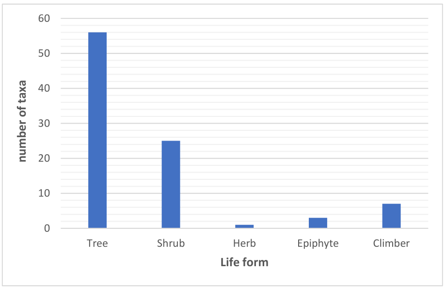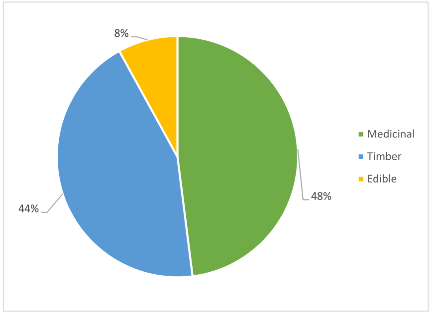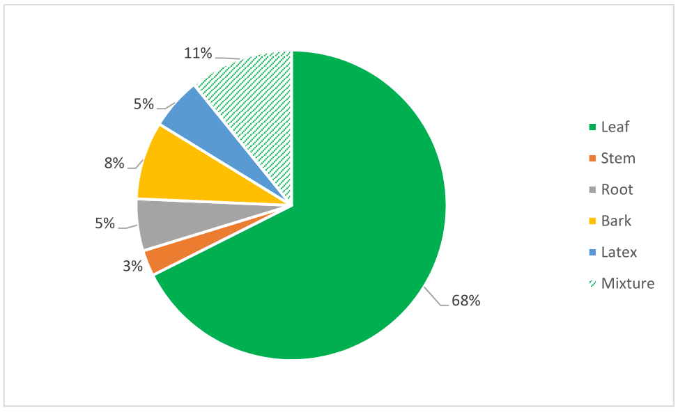 本研究中,共有65名年龄在25岁到75岁之间的当地土著居民接受了调查。调查记录了Tampolo森林及周边被当地土著民传统利用的123种植物,其中森林植物92种,荒地植物31种。这些物种被用作为木材(44%)、食品(8%)或草药(48%)(图2)等。药用植物主要被用于治疗胃病(71%)、发热(33.3%)和疲劳(25%)等,其中叶片是使用最多的植物部位(68%) (图4)。对20种特有药用植物进行植物化学分析,结果表明,这些植物中的一些重要化合物成分可能与治疗效果相关。从Tampolo森林采集的植物种类中,保护等级为略需关注(LC)的物种占大多数(41%),而易危种(VU)和近危种(NT)分别占11%和8%(图5),有一个物种——Breonia madagascariensis A.Rich为极危(CR)等级。