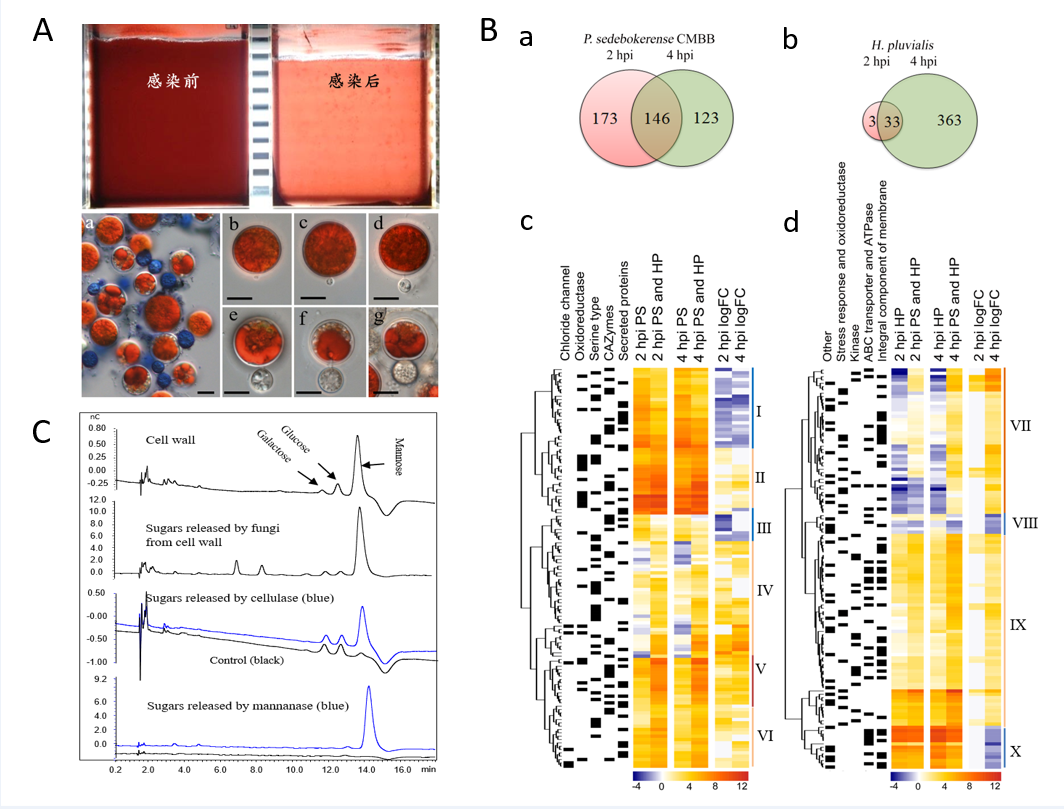 图1真菌和雨生红球藻互作。A,真菌寄生雨生红球藻的过程;B,真菌P. sedebokerense (PS)寄生雨生红球藻H. pluvialis (HP)的双转录组学研究;C,不同水解酶和真菌释放的雨生红球藻细胞壁糖分析