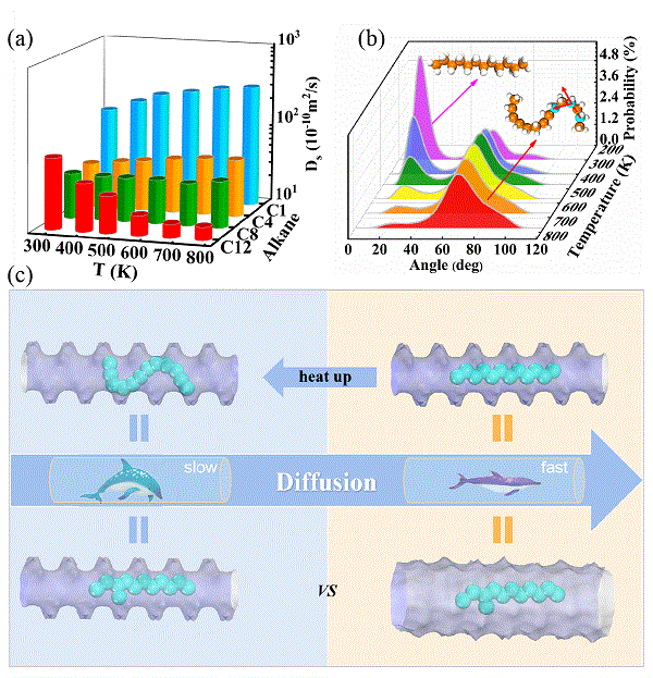 “热阻”通常指的是物体对热量传导的阻碍效果。该工作将“热阻”概念引入到传质过程中,发现“热阻效应”引起分子筛反常的扩散需要满足以下两个条件。首先吸附分子需要有一定的长度和柔性,其分子链长和弯曲程度随温度呈现明显变化。 其次,该类反常扩散现象需要特定的限域环境。只有当孔径与高温下长链分子形变后的维度接近时,“热阻效应”导致的反常扩散现象才会呈现。而在气相或者在孔径较大的多孔材料中通常呈现正常的扩散现象(温度越高扩散越快),不易发生此类反常现象(图1c)。该工作丰富了反常扩散的种类,揭示了高温下长链烷烃扩散受阻的微观机理,对于分子筛催化反应条件选择和优化也具有重要指导意义。