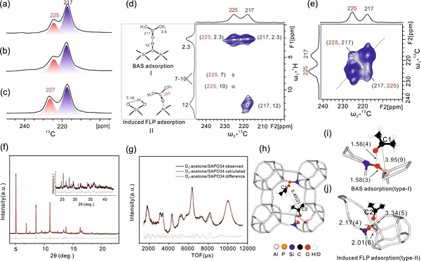 丙酮吸附在SAPO分子筛上的固体核磁实验结果(a-e);同步辐射X射线衍射/中子衍射实验得到的两种丙酮吸附构型(f-j)