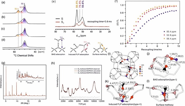 甲醇吸附在SAPO分子筛上的固体核磁实验结果(a-f)和同步辐射X射线衍射/中子衍射实验确定的甲醇吸附构型(g- j)
